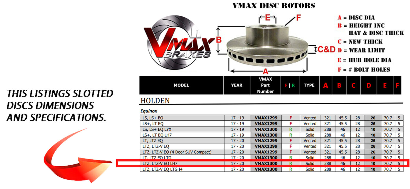 This sale is for a new pair (2 disc rotors) of Genuine VMAX Dimple Drilled & Slotted Performance Rear disc brake rotors to suit HOLDEN Equinox LTZ, LTZ-V EQ LH7 models built 2017-2020 and are a direct replacement item.