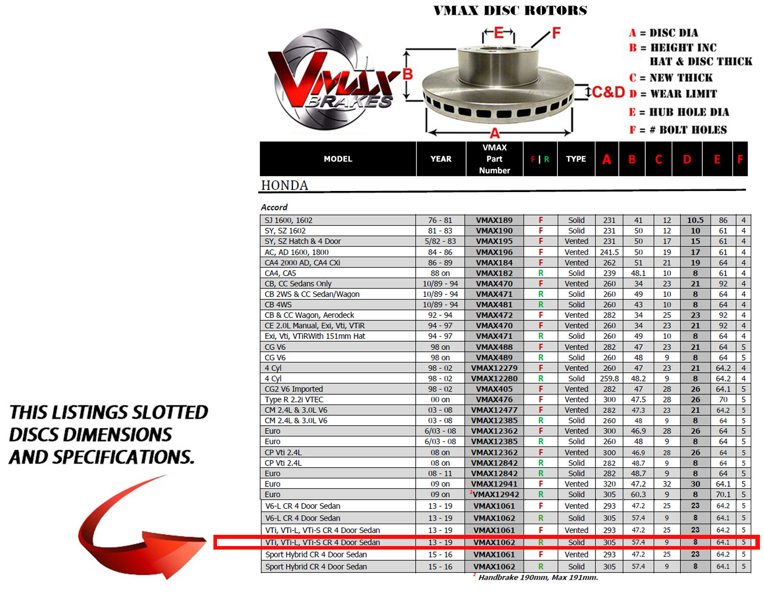 This sale is for a new pair (2 disc rotors) of Genuine VMAX Dimple Drilled & Slotted Performance Rear Disc Brake Rotors to suit HONDA Accord VTi, VTi-L, VTi-S CR 4 Door Sedan models built 2013 till 2019 and are a direct replacement item.