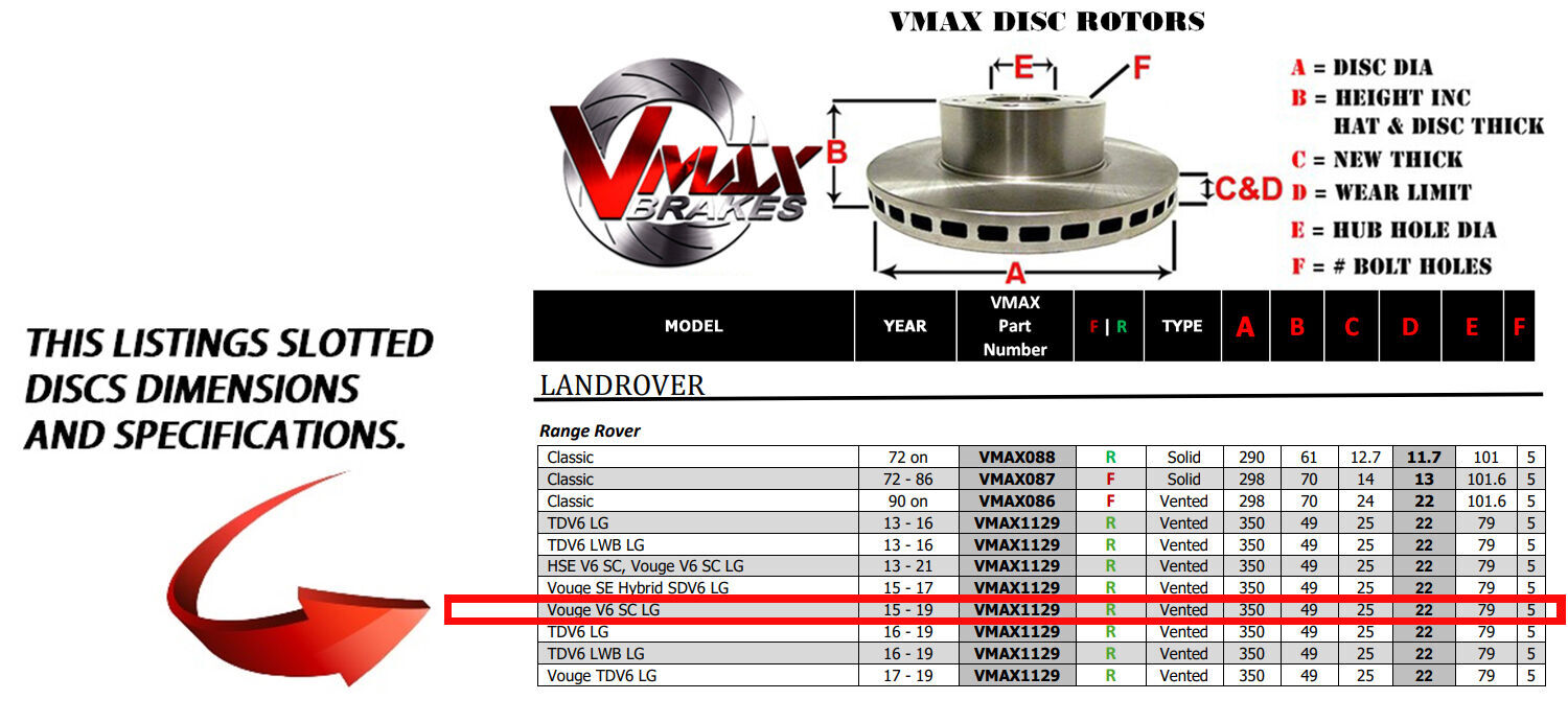 This sale is for a new pair (2 disc rotors) of Genuine VMAX Dimple Drilled & Slotted Performance Rear Disc Brake Rotors to suit LANDROVER Range Rover Vouge V6 SC LG models built 2015 till 2019 and are a direct replacement item.
