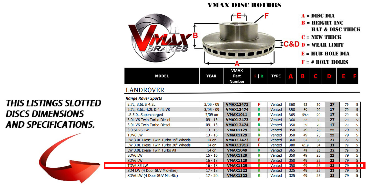 This sale is for a new pair (2 disc rotors) of Genuine VMAX Dimple Drilled & Slotted Performance Rear Disc Brake Rotors to suit LANDROVER Range Rover Sports TDV6 SE LW models built 2016 till 2018 and are a direct replacement item.