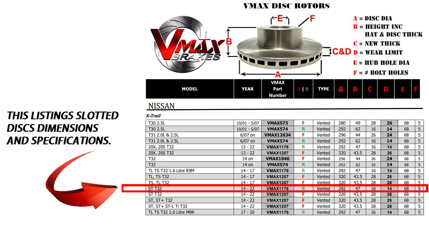 This sale is for a new pair (2 disc rotors) of Genuine VMAX Dimple Drilled & Slotted Performance Rear Disc Brake Rotors to suit NISSAN X-Trail ST T32 models built 2014 till 2022 and are a direct replacement item.