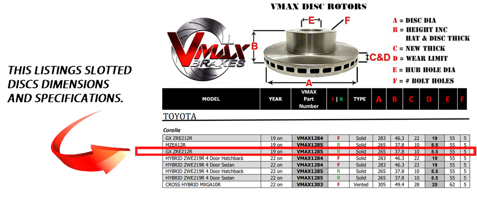 This sale is for a new pair (2 disc rotors) of Genuine VMAX Dimple Drilled & Slotted Performance Rear disc brake rotors to suit TOYOTA Corolla GX ZRE212R models built 2019 Onwards and are a direct replacement item.