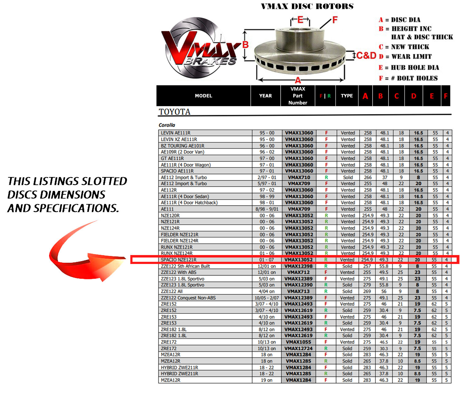 This sale is for a new pair (2 disc rotors) of Genuine VMAX Dimple Drilled & Slotted Performance Rear disc brake rotors to suit TOYOTA Corolla SPACIO NZE121R models built 2001-2007 and are a direct replacement item.
