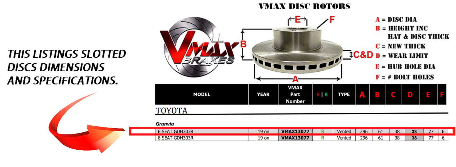 This sale is for a new pair (2 disc rotors) of Genuine VMAX Dimple Drilled & Slotted Performance Rear disc brake rotors to suit TOYOTA Granvia 6 SEAT GDH303R models built 2019 Onwards and are a direct replacement item.