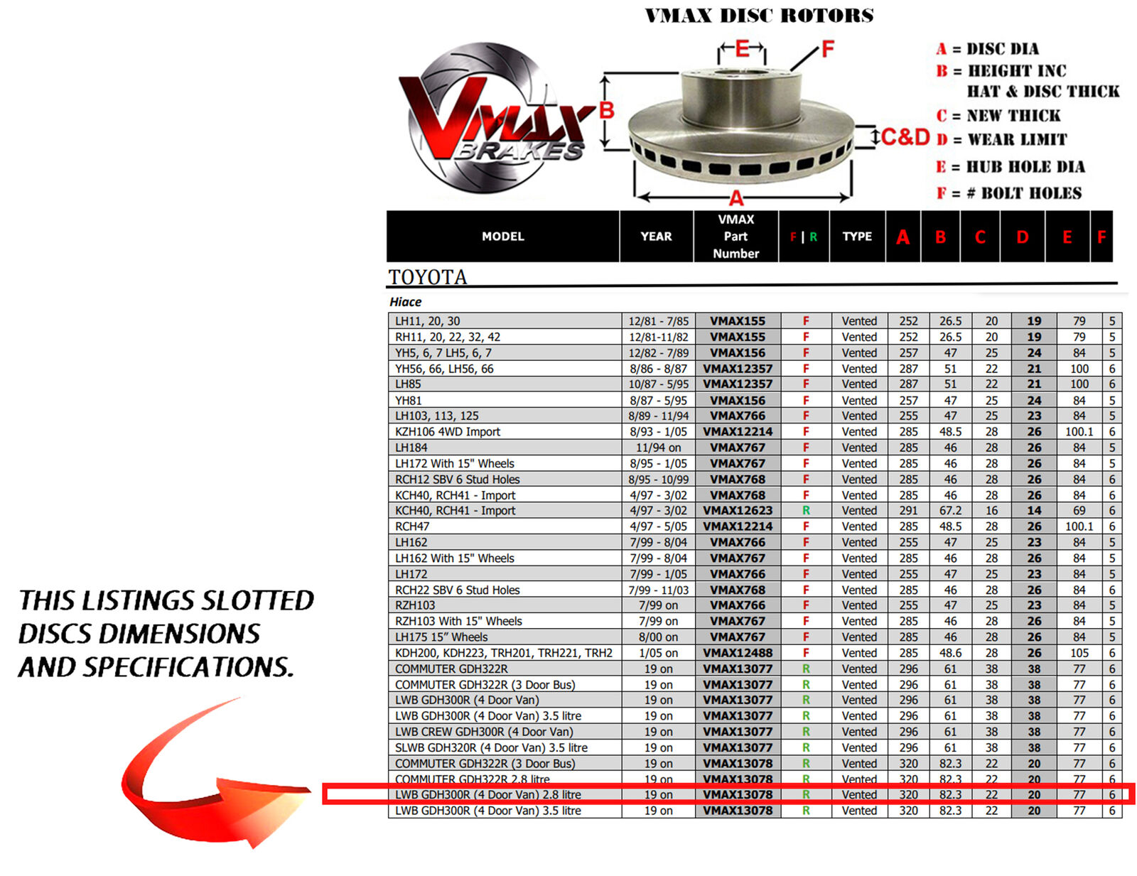 This sale is for a new pair (2 disc rotors) of Genuine VMAX Dimple Drilled & Slotted Performance Rear disc brake rotors to suit TOYOTA Hiace LWB GDH300R (4 Door Van) 2.8 litre models built 2019 Onwards and are a direct replacement item.