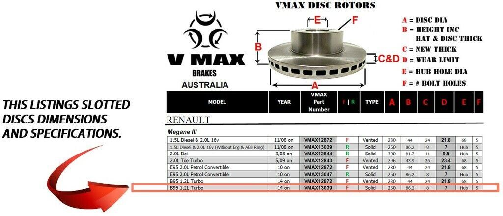 This sale is for a new pair (2 disc rotors) of Genuine VMAX Dimple Drilled & Slotted Performance Front disc brake rotors to suit RENAULT Megane III B95 1.2L Turbo models built 2014 Onwards and are a direct replacement item.