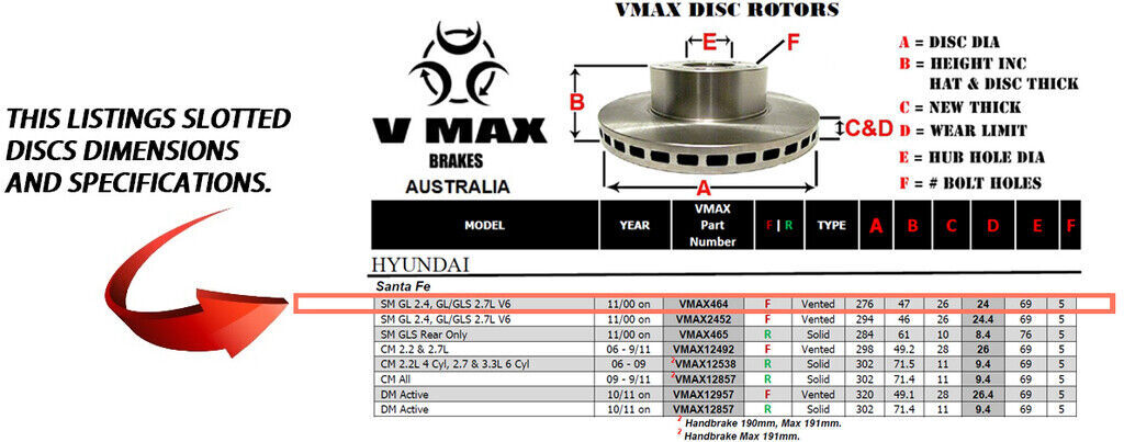 This sale is for a new pair (2 disc rotors) of Genuine VMAX Dimple Drilled & Slotted Performance Front disc brake rotors to suit HYUNDAI Santa Fe SM GL 2.4 GL GLS 2.7 models built 2000 Onwards and are a direct replacement item.