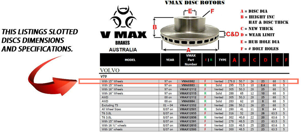 This sale is for a new pair (2 disc rotors) of Genuine VMAX Dimple Drilled & Slotted Performance Front disc brake rotors and a matching Front set of brake pads to suit VOLVO V70 models built 1997 Onwards and are a direct replacement item.