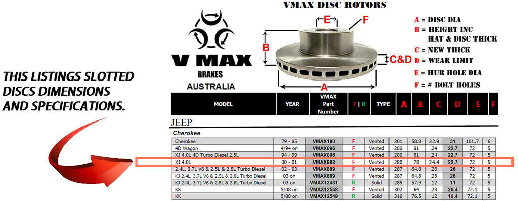 This sale is for a new pair (2 disc rotors) of Genuine VMAX Dimple Drilled & Slotted Performance Front disc brake rotors and a matching Front set of brake pads to suit JEEP Cherokee XJ 4.0L models built 2000 till 2001 and are a direct replacement item.