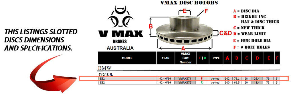 This sale is for a new pair (2 disc rotors) of Genuine VMAX Dimple Drilled & Slotted Performance Front disc brake rotors and a matching Front set of brake pads to suit BMW 740i iL E32 models built 1992 till 1994 and are a direct replacement item.