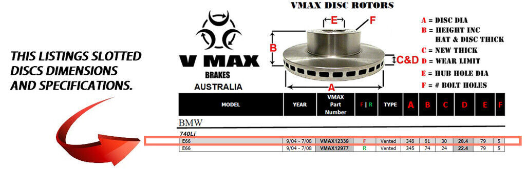 This sale is for a new pair (2 disc rotors) of Genuine VMAX Dimple Drilled & Slotted Performance Front disc brake rotors and a matching Front set of brake pads to suit BMW 740Li E66 models built 2004 till 2008 and are a direct replacement item.