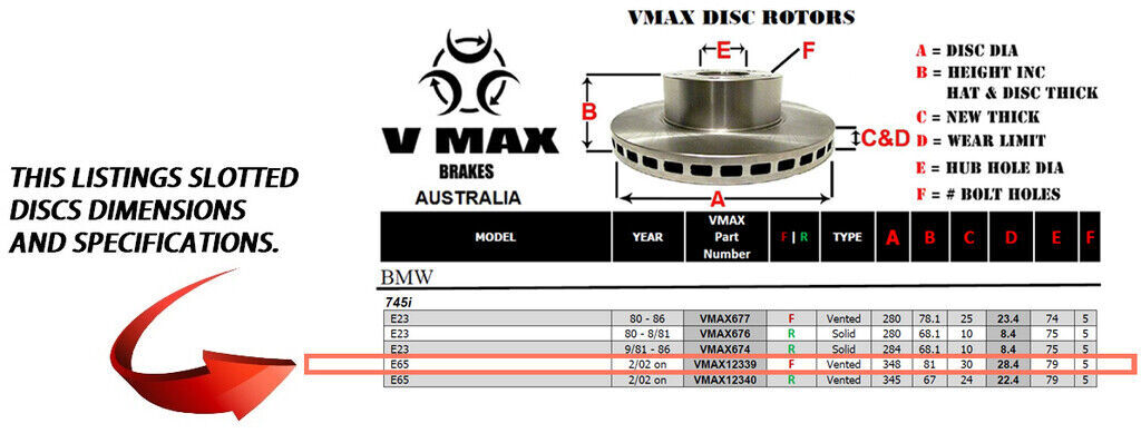This sale is for a new pair (2 disc rotors) of Genuine VMAX Dimple Drilled & Slotted Performance Front disc brake rotors and a matching Front set of brake pads to suit BMW 745i E65 models built 2002 Onwards and are a direct replacement item.