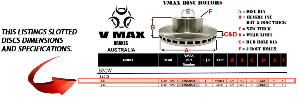 This sale is for a new pair (2 disc rotors) of Genuine VMAX Dimple Drilled & Slotted Performance Front disc brake rotors and a matching Front set of brake pads to suit BMW 840Ci E31 models built 1989 till 1999 and are a direct replacement item.