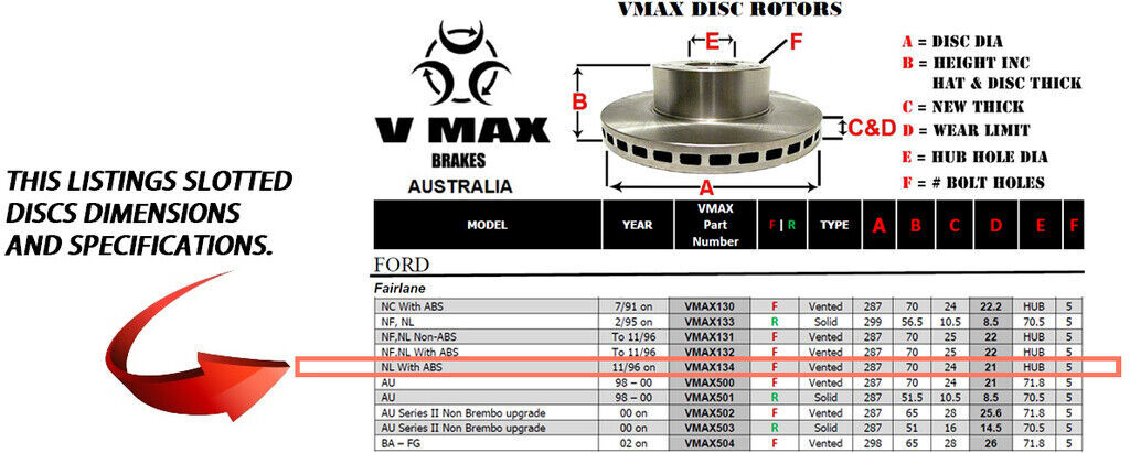This sale is for a new pair (2 disc rotors) of Genuine VMAX Dimple Drilled & Slotted Performance Front disc brake rotors and a matching Front set of brake pads to suit FORD Fairlane NL With ABS models built 1996 Onwards and are a direct replacement item.
