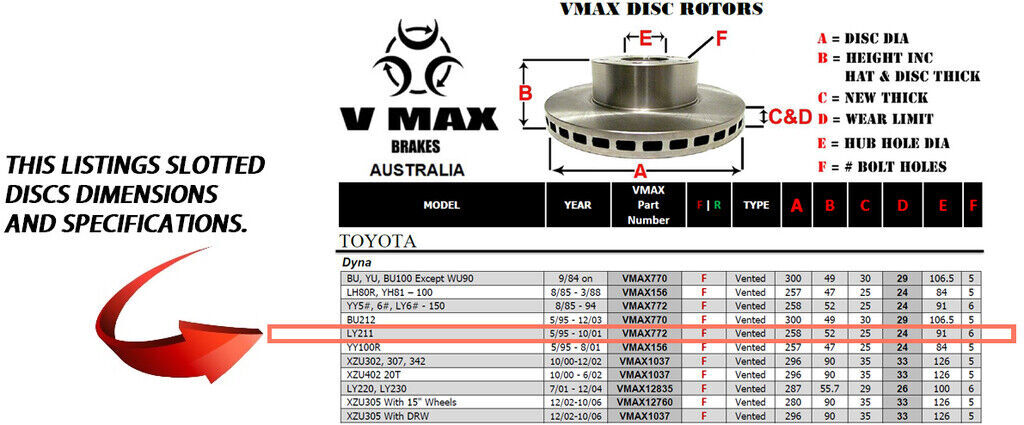 This sale is for a new pair (2 disc rotors) of Genuine VMAX Dimple Drilled & Slotted Performance Front disc brake rotors and a matching Front set of brake pads to suit TOYOTA Dyna LY211 models built 1995 till 2001 and are a direct replacement item.