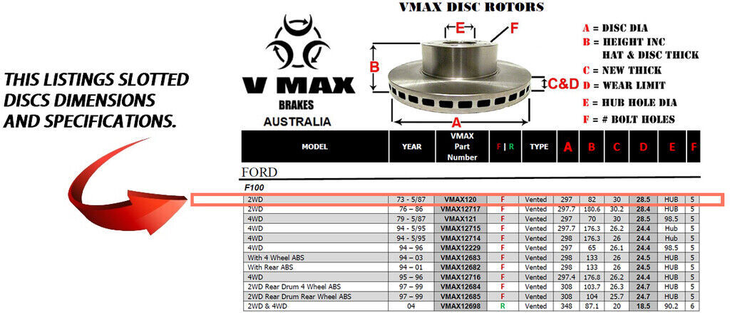 This sale is for a new pair (2 disc rotors) of Genuine VMAX Dimple Drilled & Slotted Performance Front disc brake rotors and a matching Front set of brake pads to suit FORD F100 2WD models built 1973 till 1987 and are a direct replacement item.