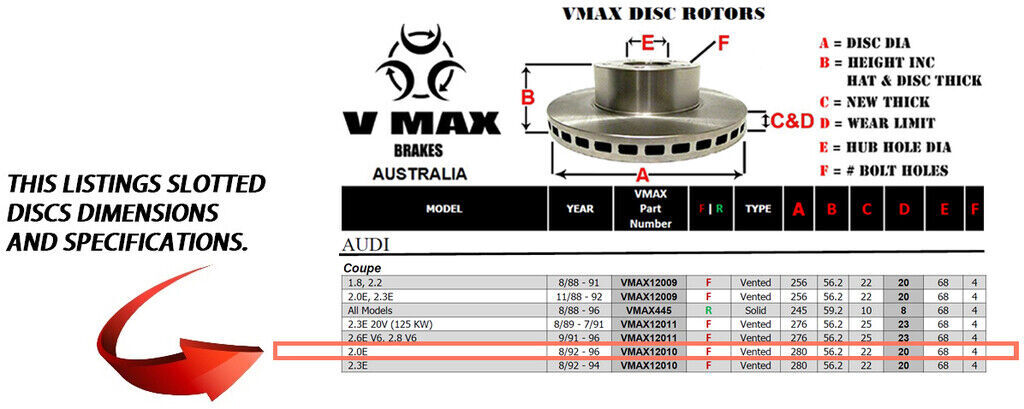 This sale is for a new pair (2 disc rotors) of Genuine VMAX Dimple Drilled & Slotted Performance Front disc brake rotors and a matching Front set of brake pads to suit AUDI Coupe 2.0E models built 1992 till 1996 and are a direct replacement item.