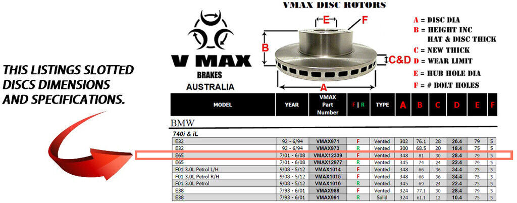 This sale is for a new pair (2 disc rotors) of Genuine VMAX Dimple Drilled & Slotted Performance Front disc brake rotors and a matching Front set of brake pads to suit BMW 740i 740iL E65 models built 2001 till 2008 and are a direct replacement item.