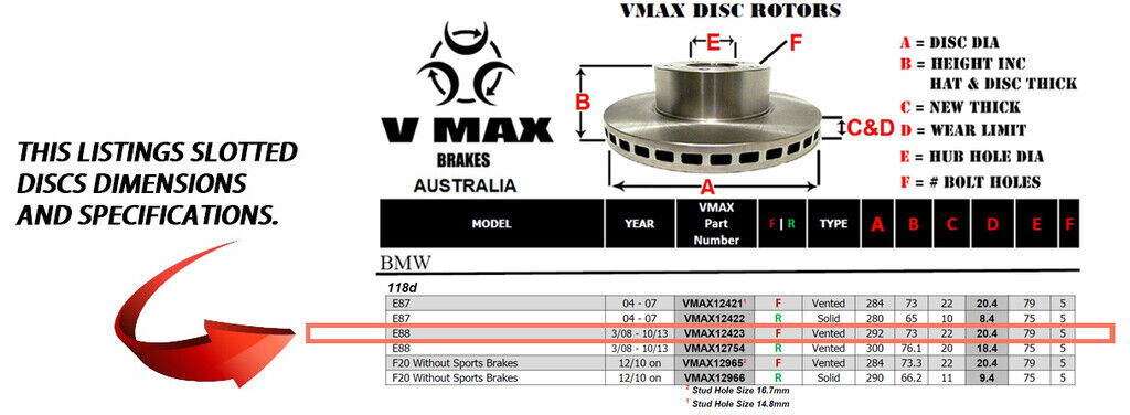 This sale is for a new pair (2 disc rotors) of Genuine VMAX Dimple Drilled & Slotted Performance Front disc brake rotors and a matching Front set of brake pads to suit BMW 118d E88 models built 2008 till 2013 and are a direct replacement item.