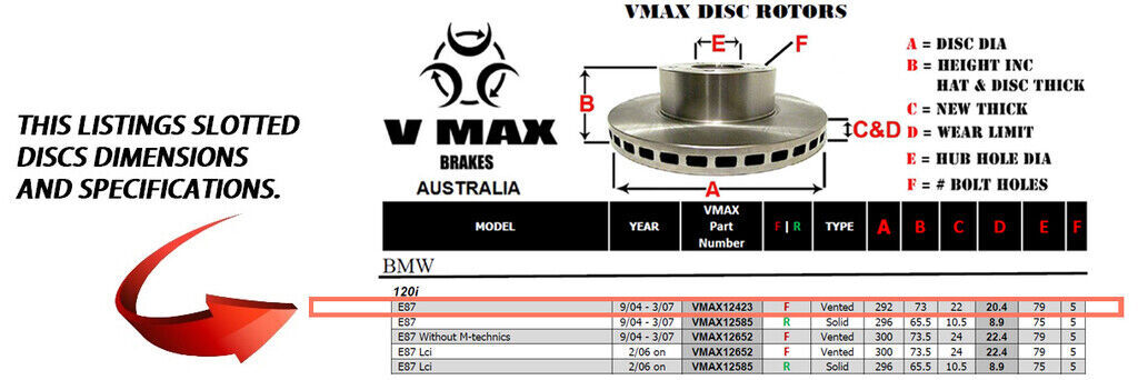 This sale is for a new pair (2 disc rotors) of Genuine VMAX Dimple Drilled & Slotted Performance Front disc brake rotors and a matching Front set of brake pads to suit BMW 120i E87 models built 2004 till 2007 and are a direct replacement item.