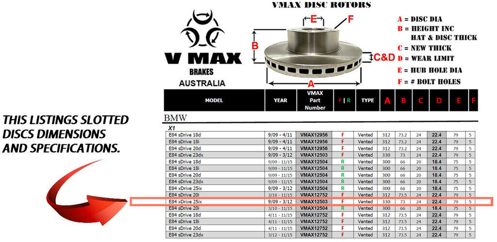 This sale is for a new pair (2 disc rotors) of Genuine VMAX Dimple Drilled & Slotted Performance Front disc brake rotors and a matching Front set of brake pads to suit BMW X1 E84 xDrive 25ix models built 2009 till 2012 and are a direct replacement item.