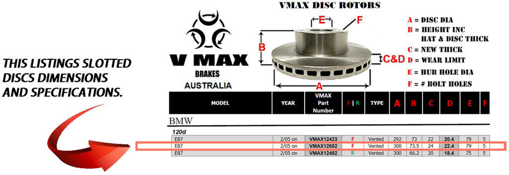 This sale is for a new pair (2 disc rotors) of Genuine VMAX Dimple Drilled & Slotted Performance Front disc brake rotors and a matching Front set of brake pads to suit BMW 120d E87 models built 2005 Onwards and are a direct replacement item.