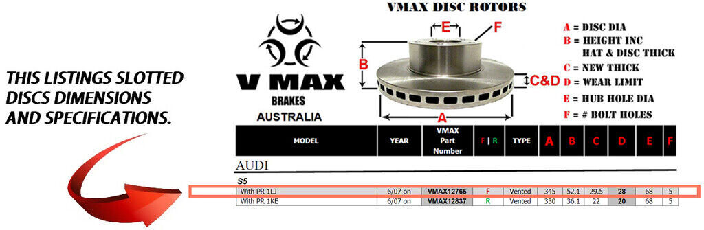 This sale is for a new pair (2 disc rotors) of Genuine VMAX Dimple Drilled & Slotted Performance Front disc brake rotors and a matching Front set of brake pads to suit AUDI S5 With PR 1LJ models built 2007 Onwards and are a direct replacement item.