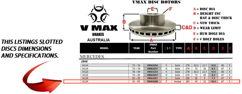 This sale is for a new pair (2 disc rotors) of Genuine VMAX Dimple Drilled & Slotted Performance Front disc brake rotors and a matching Front set of brake pads to suit MERCEDES 280E W124 models built 1991 till 1995 and are a direct replacement item.