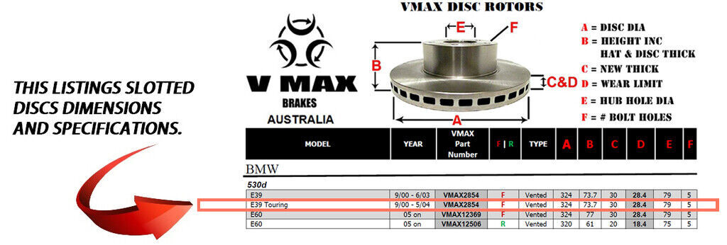 This sale is for a new pair (2 disc rotors) of Genuine VMAX Dimple Drilled & Slotted Performance Front disc brake rotors and a matching Front set of brake pads to suit BMW 530d E39 Touring models built 2000 till 2004 and are a direct replacement item.