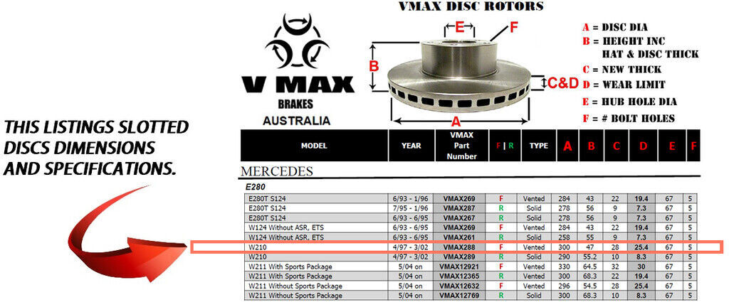 This sale is for a new pair (2 disc rotors) of Genuine VMAX Dimple Drilled & Slotted Performance Front disc brake rotors and a matching Front set of brake pads to suit MERCEDES E280 W210 models built 1997 till 2002 and are a direct replacement item.