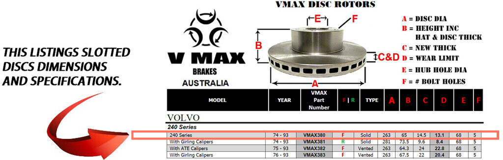 This sale is for a new pair (2 disc rotors) of Genuine VMAX Dimple Drilled & Slotted Performance Front disc brake rotors and a matching Front set of brake pads to suit VOLVO 240 Series models built 1974 till 1993 and are a direct replacement item.