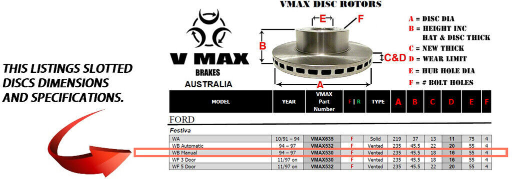 This sale is for a new pair (2 disc rotors) of Genuine VMAX Dimple Drilled & Slotted Performance Front disc brake rotors and a matching Front set of brake pads to suit FORD Festiva WB Manual models built 1994 till 1997 and are a direct replacement item.