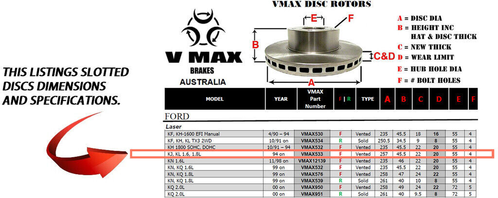 This sale is for a new pair (2 disc rotors) of Genuine VMAX Dimple Drilled & Slotted Performance Front disc brake rotors and a matching Front set of brake pads to suit FORD Laser KJ KL 1.6 1.8L models built 1994 Onwards and are a direct replacement item.