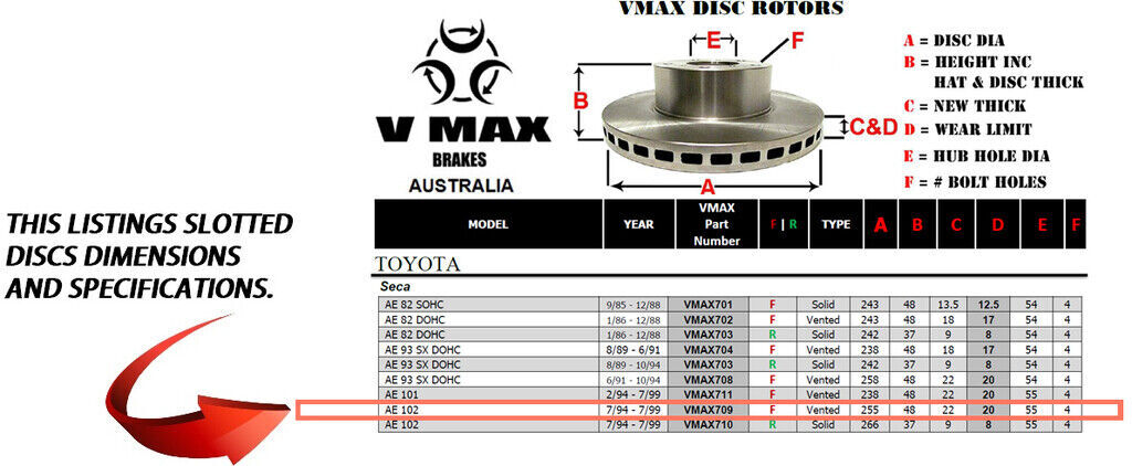 This sale is for a new pair (2 disc rotors) of Genuine VMAX Dimple Drilled & Slotted Performance Front disc brake rotors and a matching Front set of brake pads to suit TOYOTA Seca AE102 models built 1994 till 1999 and are a direct replacement item.
