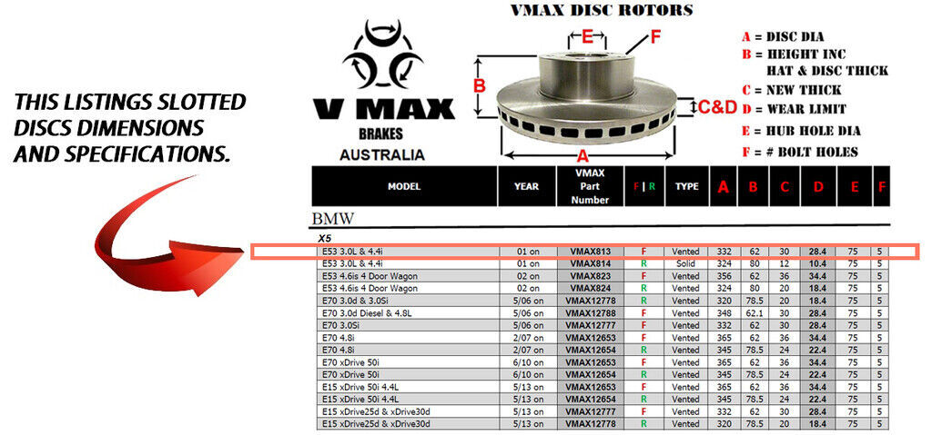 This sale is for a new pair (2 disc rotors) of Genuine VMAX Dimple Drilled & Slotted Performance Front disc brake rotors and a matching Front set of brake pads to suit BMW X5 E53 3.0L 4.4i models built 2001 Onwards and are a direct replacement item.