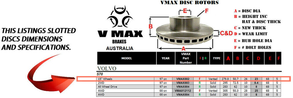 This sale is for a new pair (2 disc rotors) of Genuine VMAX Dimple Drilled & Slotted Performance Front disc brake rotors and a matching Front set of brake pads to suit VOLVO S70 15" Wheels models built 1997 Onwards and are a direct replacement item.