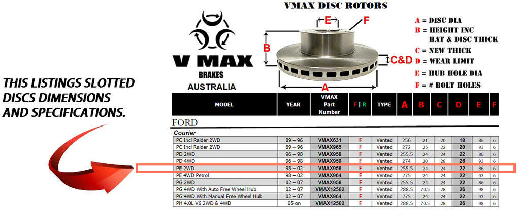 This sale is for a new pair (2 disc rotors) of Genuine VMAX Dimple Drilled & Slotted Performance Front disc brake rotors and a matching Front set of brake pads to suit FORD Courier PE 2WD models built 1998 till 2002 and are a direct replacement item.