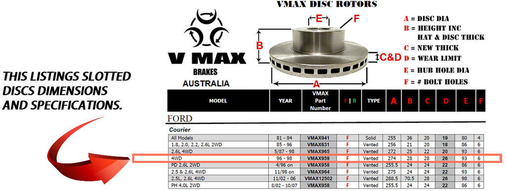 This sale is for a new pair (2 disc rotors) of Genuine VMAX Dimple Drilled & Slotted Performance Front disc brake rotors and a matching Front set of brake pads to suit FORD Courier 4WD models built 1996 till 1998 and are a direct replacement item.