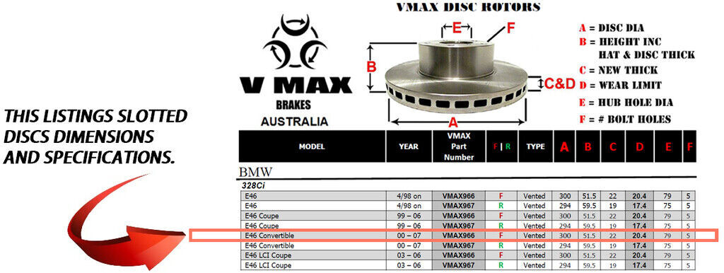 This sale is for a new pair (2 disc rotors) of Genuine VMAX Dimple Drilled & Slotted Performance Front disc brake rotors and a matching Front set of brake pads to suit BMW 328Ci E46 Convertible models built 2000 till 2007 and are a direct replacement item.
