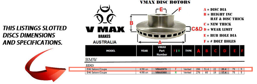 This sale is for a new pair (2 disc rotors) of Genuine VMAX Dimple Drilled & Slotted Performance Front disc brake rotors and a matching Front set of brake pads to suit BMW 323Ci E46 Saloon Coupe models built 1998 Onwards and are a direct replacement item.
