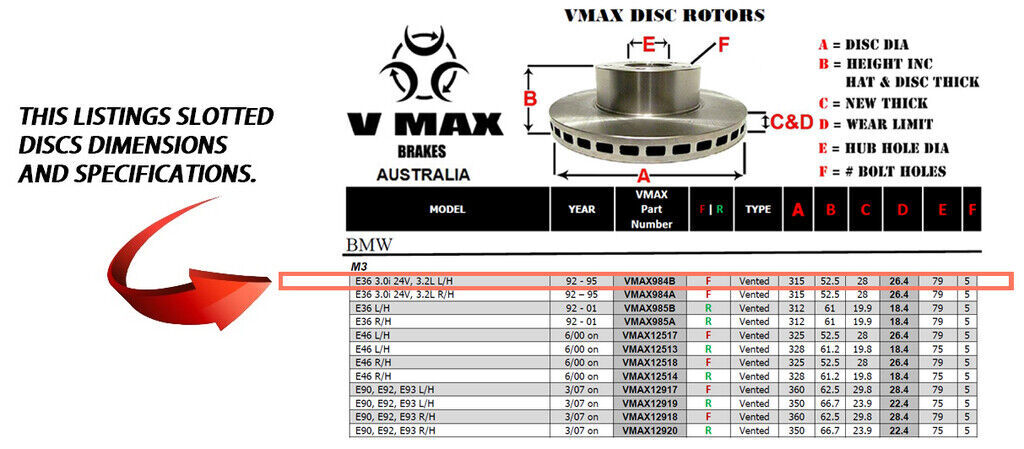 This sale is for a new pair (2 disc rotors) of Genuine VMAX Dimple Drilled & Slotted Performance Front disc brake rotors and a matching Front set of brake pads to suit BMW M3 E36 3.0i 24V 3.2L models built 1992 till 1995 and are a direct replacement item.