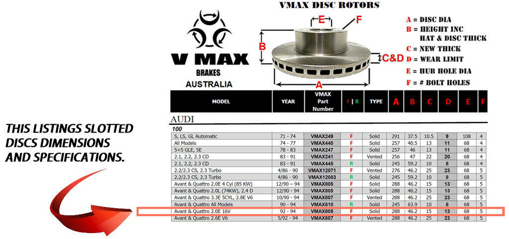 This sale is for a new pair (2 disc rotors) of Genuine VMAX Dimple Drilled & Slotted Performance Front disc brake rotors to suit AUDI 100 Avant Quattro 2.0E 16V models built 1992 till 1994 and are a direct replacement item.