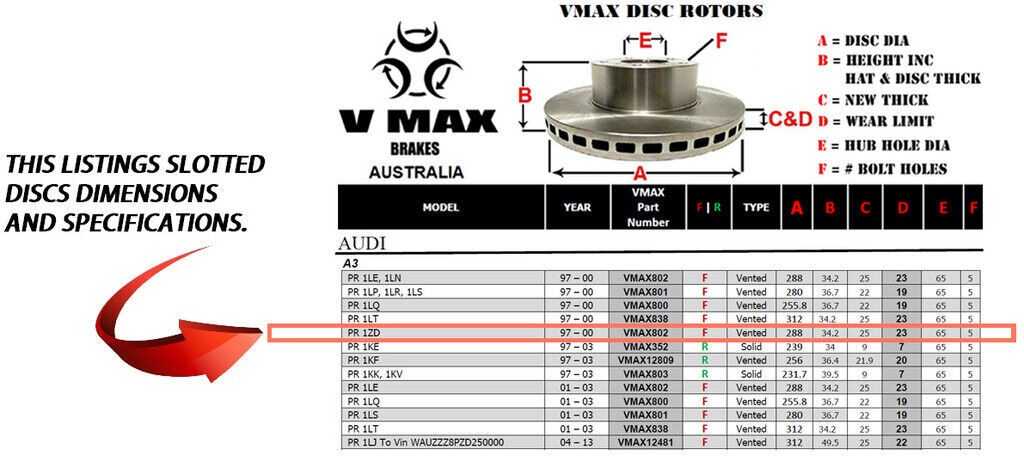This sale is for a new pair (2 disc rotors) of Genuine VMAX Dimple Drilled & Slotted Performance Front disc brake rotors to suit AUDI A3 PR 1ZD models built 1997 till 2000 and are a direct replacement item.