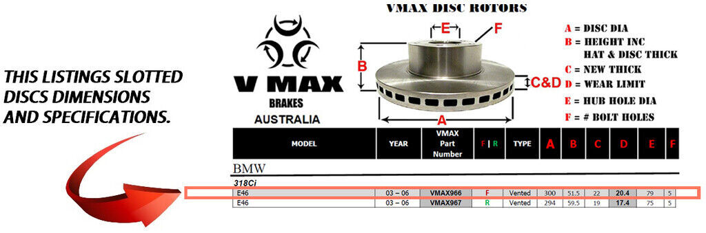 This sale is for a new pair (2 disc rotors) of Genuine VMAX Dimple Drilled & Slotted Performance Front disc brake rotors to suit BMW 318Ci E46 models built 2003 till 2006 and are a direct replacement item.