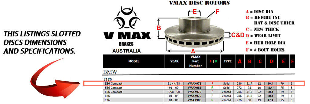 This sale is for a new pair (2 disc rotors) of Genuine VMAX Dimple Drilled & Slotted Performance Front disc brake rotors to suit BMW 318ti E36 Compact models built 1991 till 1998 and are a direct replacement item.