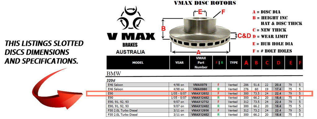 This sale is for a new pair (2 disc rotors) of Genuine VMAX Dimple Drilled & Slotted Performance Front disc brake rotors to suit BMW 320d E90 models built 2005 till 2007 and are a direct replacement item.