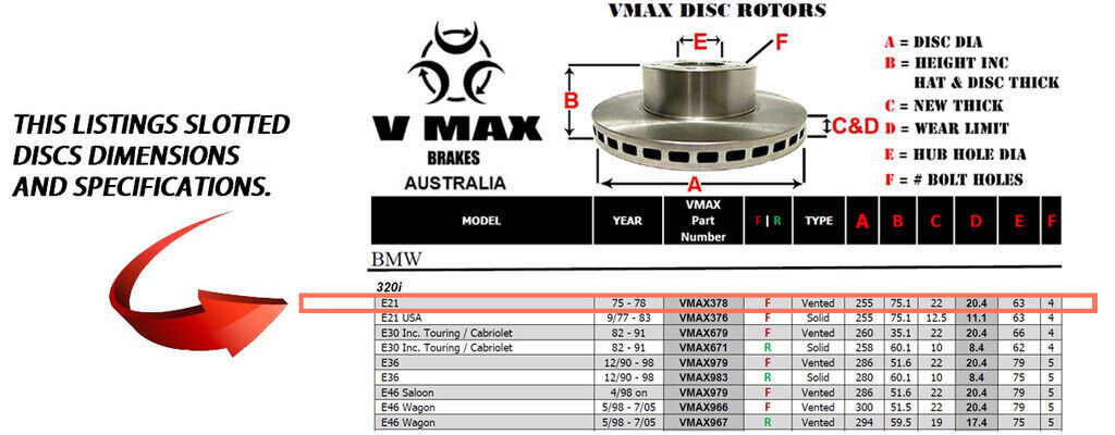 This sale is for a new pair (2 disc rotors) of Genuine VMAX Dimple Drilled & Slotted Performance Front disc brake rotors to suit BMW 320i E21 models built 1975 till 1978 and are a direct replacement item.