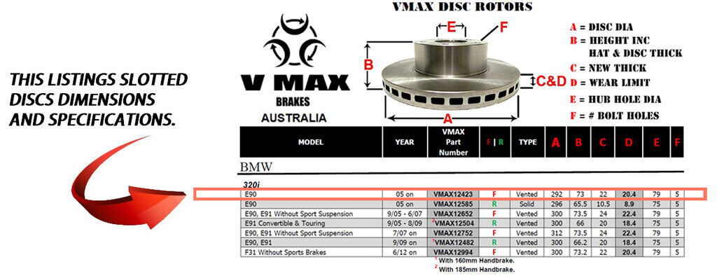 This sale is for a new pair (2 disc rotors) of Genuine VMAX Dimple Drilled & Slotted Performance Front disc brake rotors to suit BMW 320i E90 models built 2005 Onwards and are a direct replacement item.