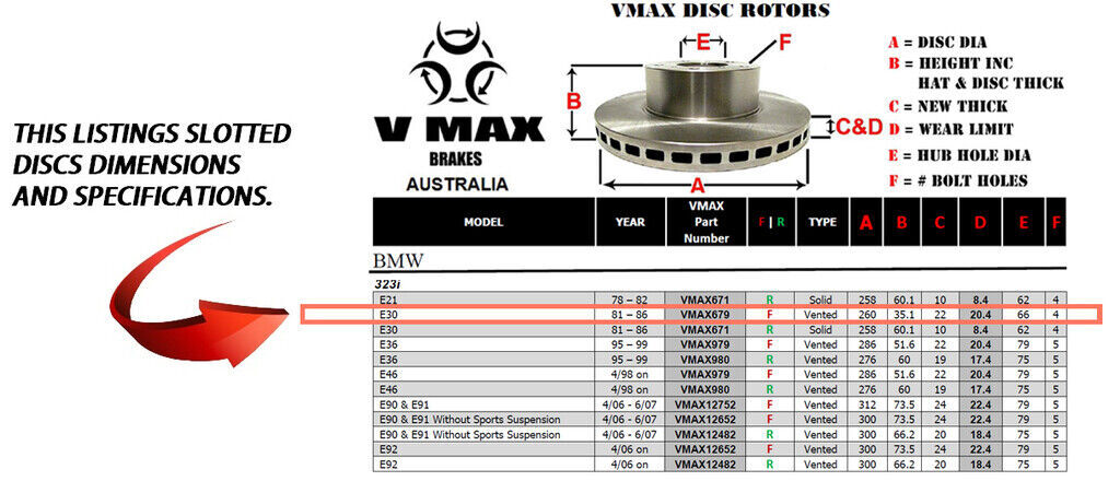 This sale is for a new pair (2 disc rotors) of Genuine VMAX Dimple Drilled & Slotted Performance Front disc brake rotors to suit BMW 323i E30 models built 1981 till 1986 and are a direct replacement item.