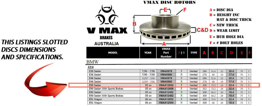 This sale is for a new pair (2 disc rotors) of Genuine VMAX Dimple Drilled & Slotted Performance Front disc brake rotors to suit BMW 323i E90 Sedan models built 2005 Onwards and are a direct replacement item.